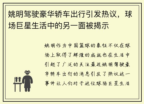 在这个快节奏的城市中,偶遇一位明星总能带给人们意外的惊喜。近日,姚明在街头漫步购物的瞬间被路人捕捉到,令无数人感到兴奋与欣喜。作为中国篮球界的传奇人物,姚明不仅以其高大的身材和卓越的球技著称,更以其谦逊和亲民形象赢得了大众的喜爱。这次街头偶遇,不仅展现了姚明生活中的一面,也让我们看到了明星与普通人生活交集的一瞬间,令人倍感温暖和振奋。文章将从姚明的人气、他的日常生活、街头偶遇带来的影响以及公众对于...
