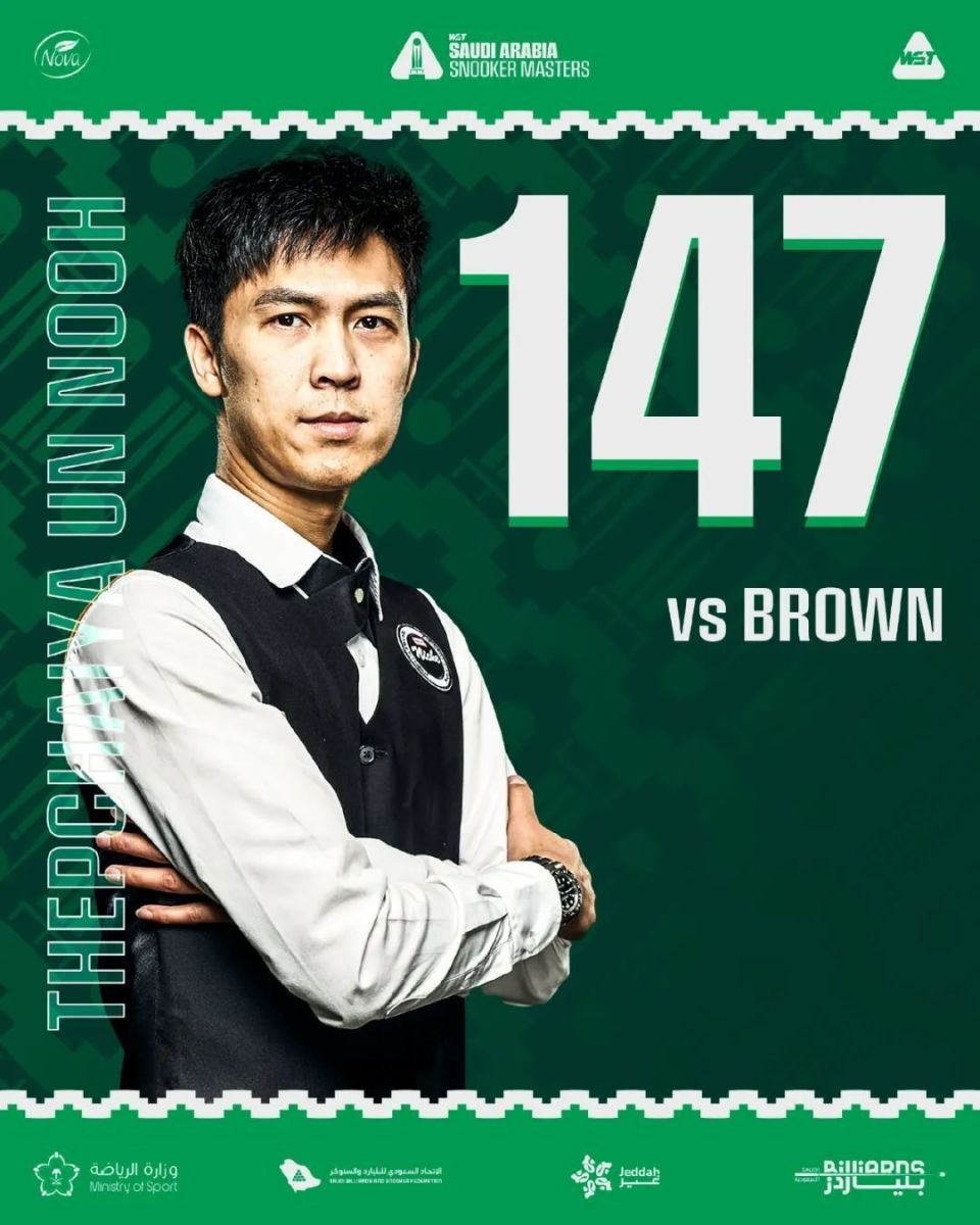 泰国快枪泰猜亚,在对阵乔丹-布朗的比赛中,轰出个人职业生涯第5杆147,成为本赛季四大赛打出147的第一位球员。具体可参阅:泰猜亚沙特大师赛轰147,个人第5杆,拿5万英镑望14.7万英镑巨奖(附视频)。
